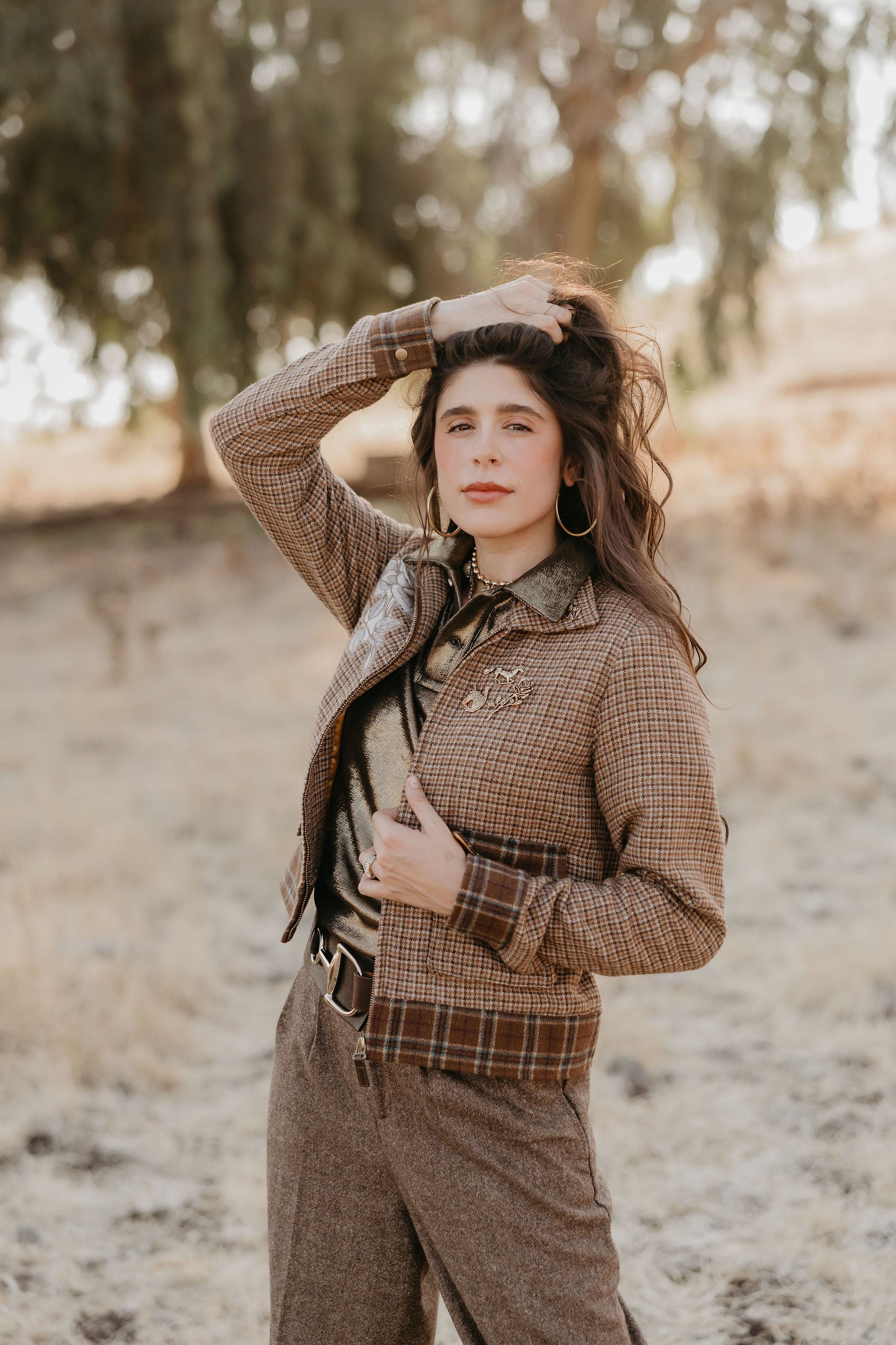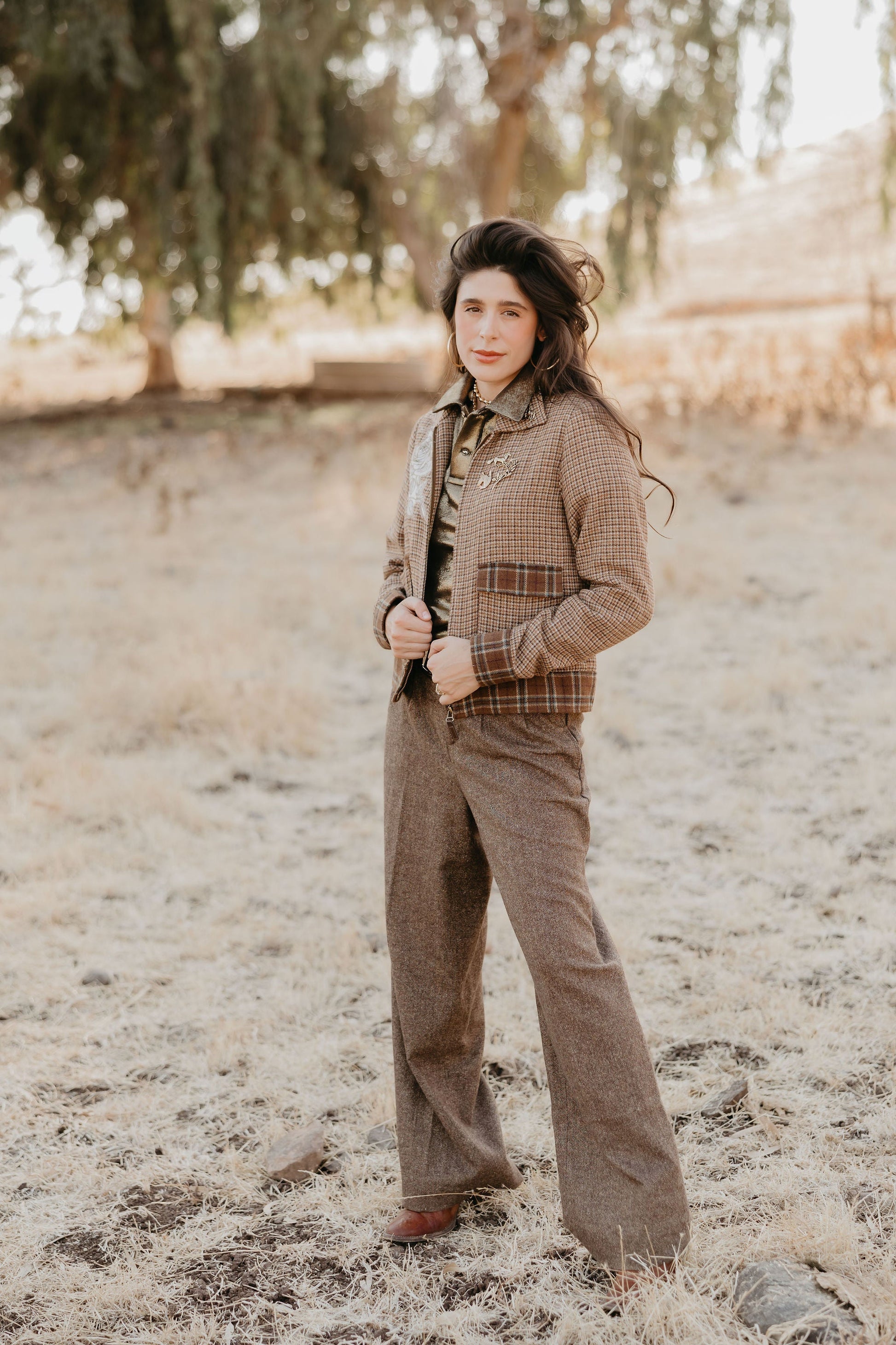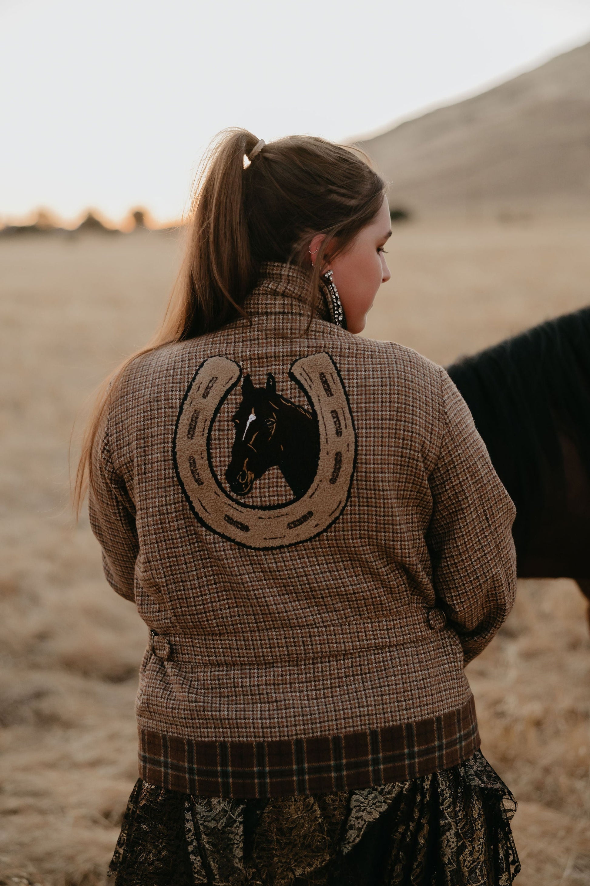 A tribute to Lily’s bronc-riding grandfather, John Holman, this 70s-inspired jacket blends cowboy grit with tweed sophistication in one legendary piece. With a lucky horseshoe motif that tips its hat to his expert horse-whispering ways, it’s the perfect mix of rodeo heritage and Western style.