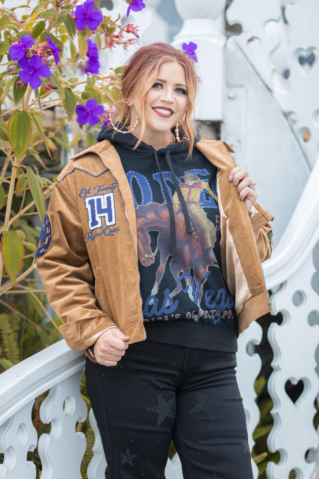 Bring the excitement of the rodeo right into your closet with this Western graphic hoodie. Blending laid-back comfort with a striking illustration of a bronc rider, it’s the perfect piece to commemorate those unforgettable memories made in Las Vegas.